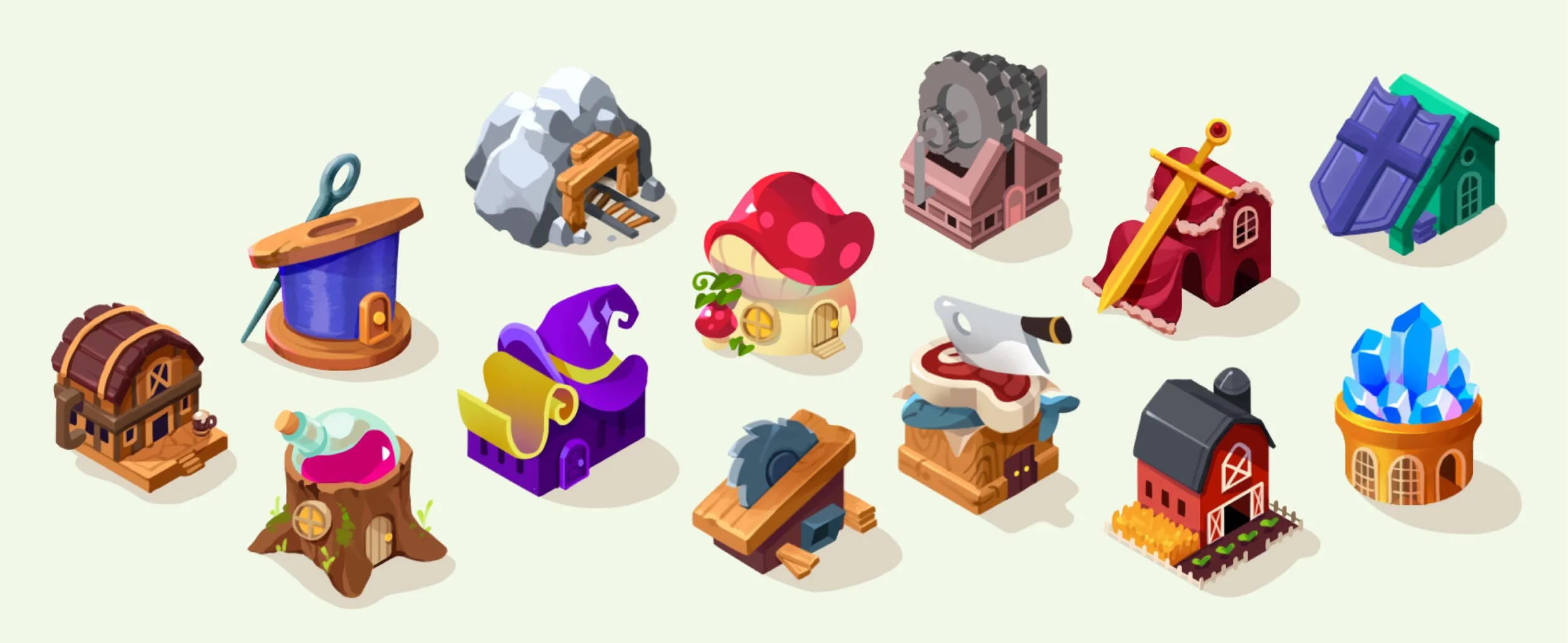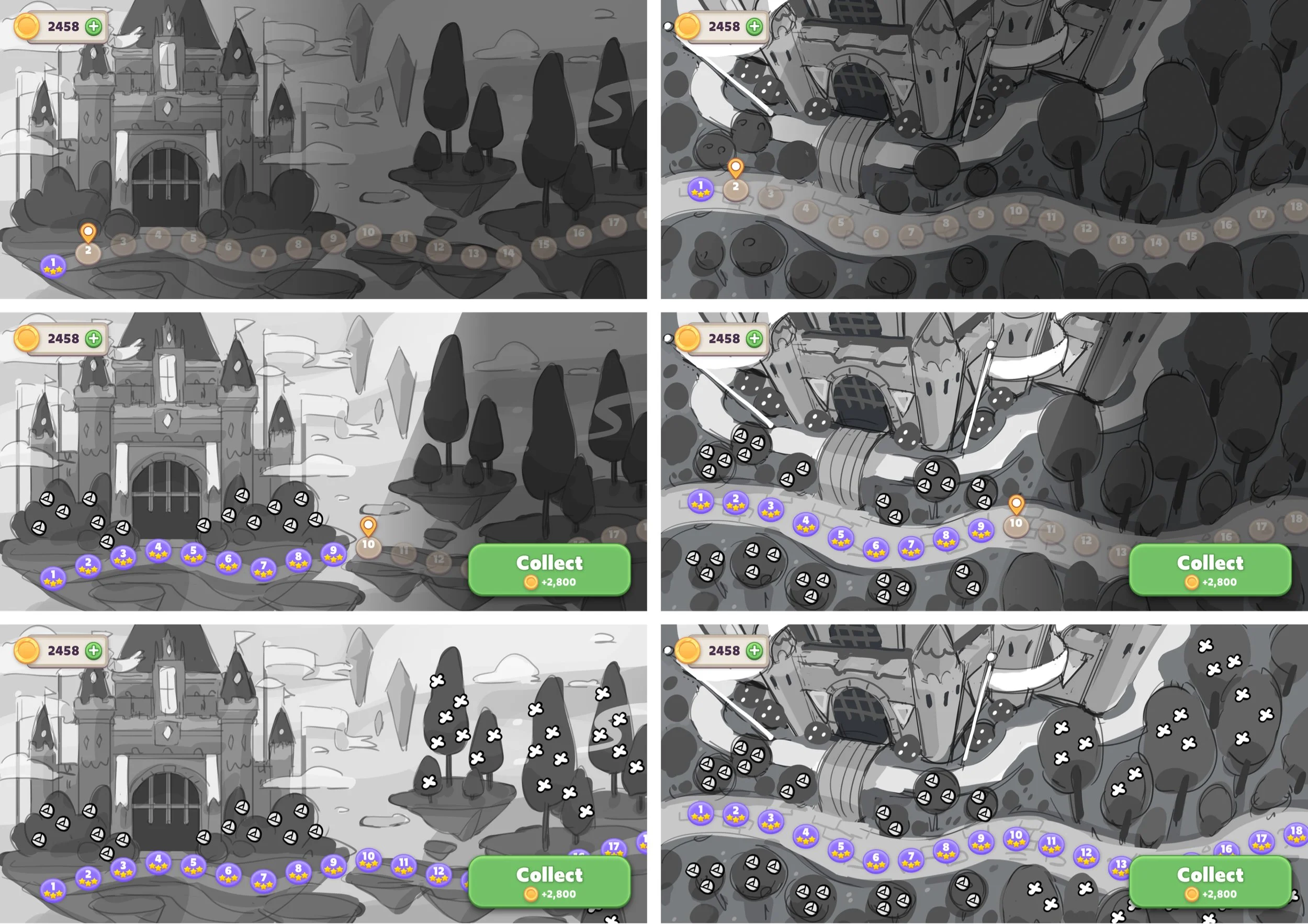 The New Games team iterated on a wide variety of game concepts during my time with Dots, ranging from letter matching to pixel art jigsaws to city builders. One of the more fleshed out explorations that we wanted to pursue was a dream kingdom-themed solitaire game which I had the opportunity to conceptualize and design early visuals for over the course of a few weeks.